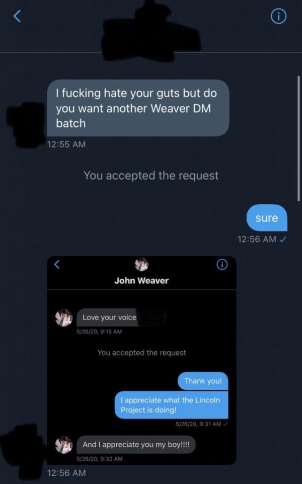 As the story was developing, Weaver was continuing his predation. At nine AM on May 26th 2020, Weaver messaged a 21-year-old man who just came off doing a media hit. Weaver said, “I love your voice [Redacted].” He responded, “thank you. I appreciate what the Lincoln Project is doing!” To which Weaver answered, “And I appreciate you, my boy.” Shortly after this exchange, Weaver blocked him from Twitter. He later interned for the Lincoln Project.